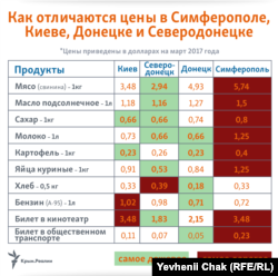 Где дороже жить: в Киеве, Северодонецке, оккупированном Донецке или аннексированном Симферополе? Корреспонденты Радіо Свобода и Крым.Реалии выяснили, как менялись цены в течение месяца и где самые дорогие/ самые дешевые продукты и услуги.